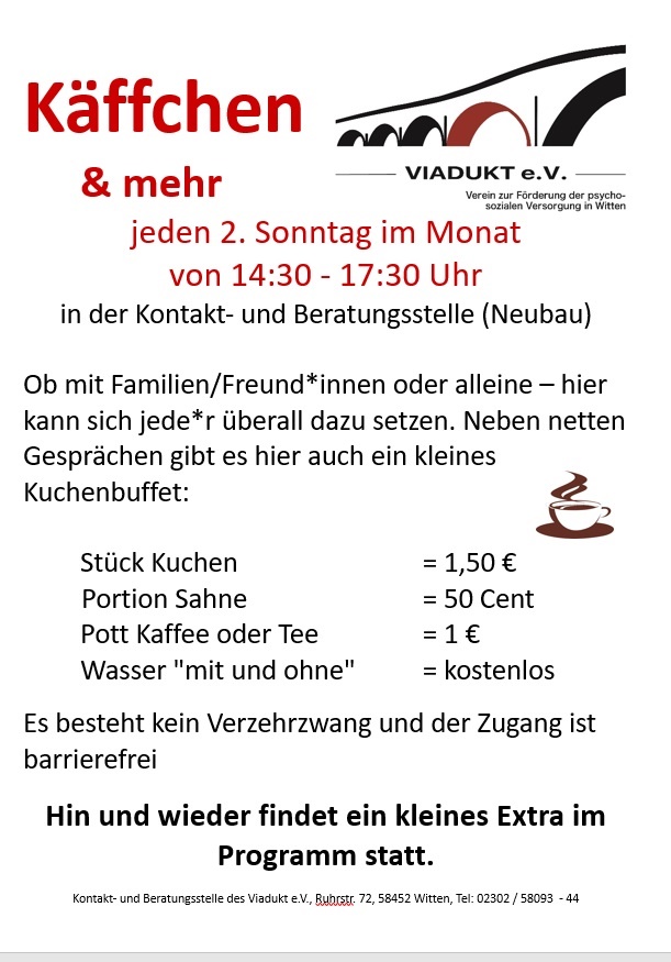 Der inklusive Sonntagstreff „Käffchen & mehr“ findet einmal im Monat in der Kontaktstelle des Viadukt e.V. statt. Die Kontaktstelle des Viadukt e.V. liegt zentral in Witten-Mitte und ist gut mit Bus und Bahn erreichbar. Die drei großen, hellen Räume sind barrierefrei und bieten viel Platz mit direktem Zugang auf die große Terrasse und zum Garten.