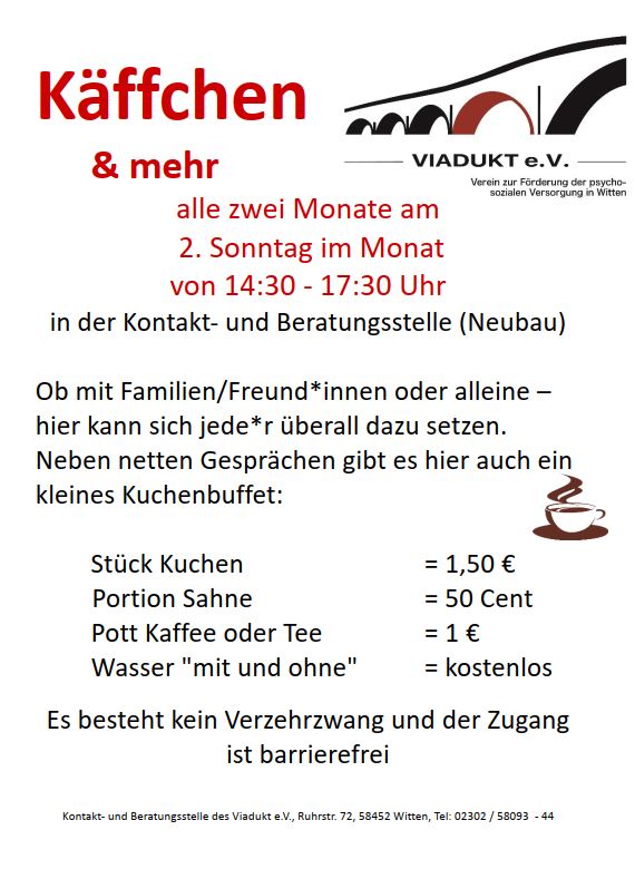 Der inklusive Sonntagstreff „Käffchen & mehr“ findet jeden zweiten Monat am 2. Sonntag im Monat in der Kontakt- und Beratungsstelle des Viadukt e.V. statt.